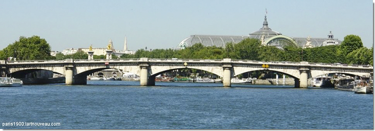 そして、「迫石」を、中央の「楔石」を除いて並び終えると、5つあるアーチの頂点の空隙に、5ヶ所同時に「楔石」を挿入する。すると、バラバラだった5つのアーチは一つの連続アーチとして強い力を持った構造物に変身する。あとは、アーチの隅の隙間を壁石で塞ぎ、橋の上部を水平にすれば工事は完了する。ここで、もう一度、コンコルド橋そのものに話を戻そう。コンコルド橋が着工された翌年には、フランス革命が起きたので、橋の建設には革命で破壊されたバスティーユ要塞の石が使用された(こうした残虐な行為を二度と起こさないという戒めのため)。18 世紀末には新古典主義が流行していたので、ペロネは作品に列柱のような外観を与えたいと考え、橋脚の先端を半円柱にし、アーチの部分と連続するようにコーニス(帯状の石)を置き、その上にデンティル(歯状装飾)付きの高欄を乗せた。なお、最初にペロネが作った時は、橋の幅は14mで十分だったが、車時代に入り、それでは狭すぎたので、1930年に技術者のデヴァル とマレによって幅30mに拡幅された。その時の方法は、橋の両側の装飾的な高欄~橋脚を取り外し、橋の両側に新たな橋脚を作り、その上にもう一度装飾的な高欄~橋脚を再設置するという手法が取られた。1枚目の写真は、コンコルド広場を入れたコンコルド橋。2枚目の写真は、できるだけ扁平なアーチを感じさせるように離れて撮ったもの。2枚目の写真の橋の下を見ると、1930年に各幅した時に両側に追加された橋脚がよく見える(追加部分の橋脚は、ペロネの橋脚と離して設けられたので、短、長、短と3つ見える)。私は正面からの写真が欲しかったが、セーヌ川を船で観光したことはないので、パリの橋の専門サイトにあった正面からの写真(扁平なことが良く分かる)を3枚目に掲載する。