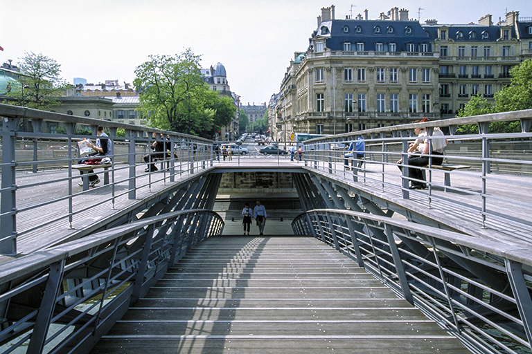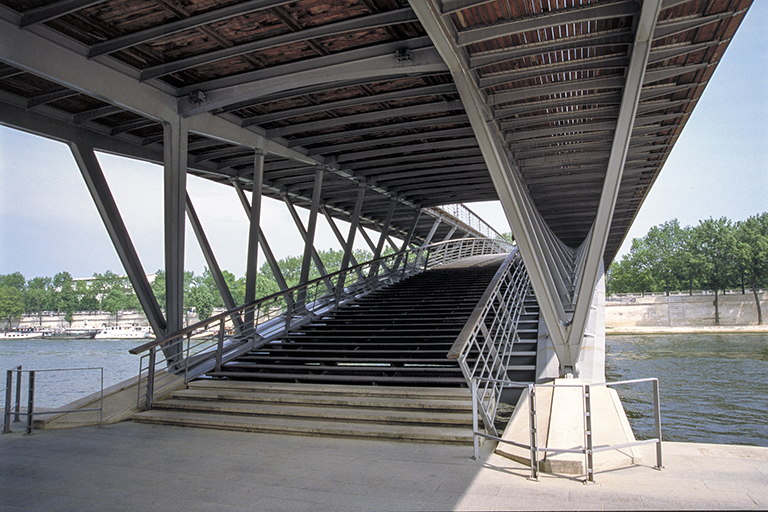 この橋は、最初ソルフェリーノ歩道橋と名付けられ、その後、2006年にレオポール・セダール・サンゴール橋(Passerelle Léopold-Sédar-Senghor)と名称変更された。私が行った時はソルフェリーノだったので、ソルフェリーノ歩道橋のままにしておく。【なぜかというと、改名にフランスの悪しき独善性を感じるから。1906年にフランスの植民地セネガルで生まれたサンゴールは、若い頃から「フランス人になりたいという願望」を持っていた。サンゴールは国際バカロレア資格を取得すると、「植民地の黒人エリート」として、1928年にパリに行き、1933年にフランス国籍を取得、古い歴史を持つ公立の後期中等教育機関リセ・ルイ=ル=グラン(LBG)で教育を受け、1937年からは詩や記事を雑誌に掲載するようになる。サンゴールの基本的姿勢は、植民地化自体は非難されるべきものではないというもの。そして、1945年に出版された『フランス帝国共同体(La Communauté impériale française)』という本の共著者の1人として、フランス連邦制の樹立が、アフリカで目覚めつつあるナショナリズムに対する唯一の防衛策だと主張した。反植民地主義運動の高まりに不安を抱いたフランスの雑誌や新聞は、「連邦主義は20世紀の真実であり、フランス連合の未来である」と述べるサンゴールに喝采を送った。サンゴールは1960年に独立したセネガルの初代大統領になる。ソルフェリーノ歩道橋を、サンゴールの名に変えたのは、サンゴールの生誕百年を祝したもの。フランス植民地擁護者への称賛でもある】。この歩道橋は、パリ市内のセーヌ川に架かる一番モダンな橋。建築家でエンジニアのマルク・モーリス・ミムラム(Marc Maurice Mimram)のデザインで、1997~99年に作られた。アレクサンドル3世橋と同じ単スパンの鋼アーチ橋だが、堤防上の河岸と、セーヌ川の遊歩道(Berges de Seine)の両方からアクセスができ、橋の中央付近で双方が合流し、その後は、対岸の河岸か遊歩道の好きな方に行くことができる。非常に面白い発想だが、構造の魔術師とも言われるスペインのサンティアゴ・カラトラバや、イギリスのウィルキンソン・エア建築事務所の作品と比べると、きわめて地味。しかし、パリの中心で橋ばかり目立っても無様(ぶざま)なので、近くの他の鉄のアーチとも似たこの橋のデザインは、少し重苦しいが、正解だったと言えなくはない。1枚目の写真は左岸下流側から撮った全景。2枚目の写真は遊歩道からの入口。3枚目の写真は少し階段を上がった所。歩く部分は、ポン=デ=ザールと同じボンゴシ材が使われている。4枚目の写真は、橋の上にある、“河岸に行く上路と遊歩道に降りて行く下路の分岐点” から撮ったもの。