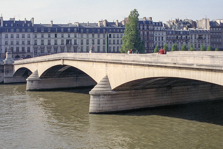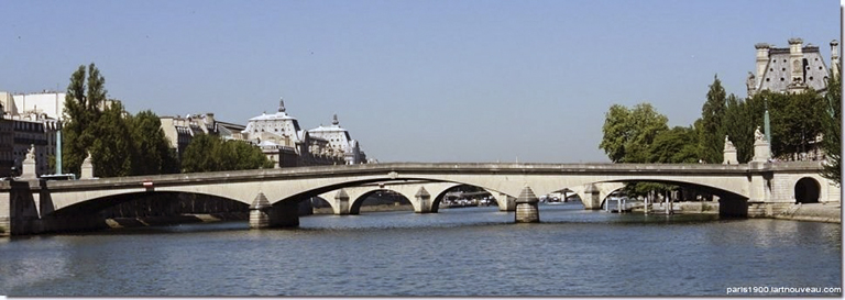 現在のカルーゼル橋は、1935~39年に架け替えられた長さ168m、3スパン(47.67m)のRCアーチ橋。ロワイヤル橋の240m上流に位置するので、スパン数こそ5から3に減らして航行に配慮したが、外観を重視し、コンクリートの上にはすべて石を張り、デザインもロワイヤル橋と同じ簡素なデザインとし、三角の橋脚の三角屋根の段差まで同じ形にして統一感にこだわった。ただ、アーチはバスケットハンドル・アーチではなく、コンコルド橋と同じ “半円アーチの上部だけを切り取った扁平なアーチ” だが、どこにも高さが書いてないので、ライズ比がどのくらい小さいのかは不明。残念なのは、建築家が4体の大きな像を橋の両端の左右に置いたこと。幸い、あまり目立たないので、ロワイヤル橋の概念は崩れていない。1枚目の写真は、https://paris1900.lartnouveau.com/ponts/ のサイトにある正面からの写真(奥に見えるロワイヤル橋の橋脚と対比できる)。2枚目の写真は、ルーブル美術館のラ・トレモワイユ・パビリオン(Pavillon de la trémoille)の正面にあるカルーゼル橋を左岸上流側から撮ったもの。3枚目の写真は、逆に、右岸上流側から橋をメインに撮ったもの。