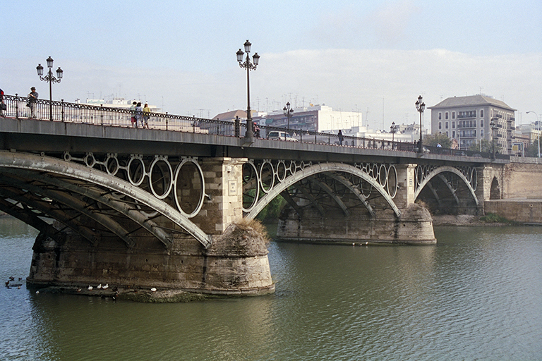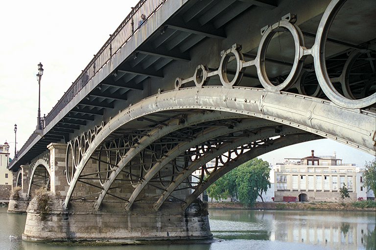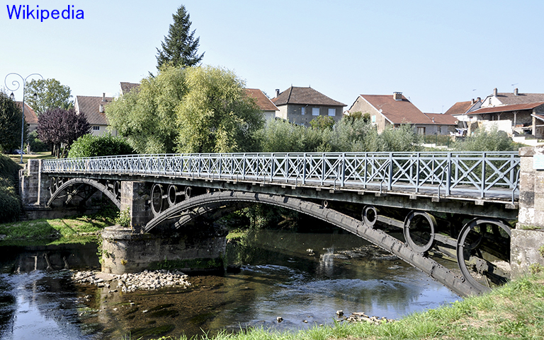 ここで、現在のカルーゼル橋よりも面白い1834年に完成した初代カルーゼル橋について触れておこう。設計者は、アントワーヌ=レミ・ポロンソー(Antoine-Rémy Polonceau)。あの、「ポロンソー形式」の生みの親の作品。長さ151m、3スパン(47.66m)の鋳鉄上路アーチ橋。1枚目の写真が、2スパンしか写っていないが、当時の写真。アーチと路面の間に、大きさの異なる鋳鉄製の輪が連続して6個並んでいる。何とも不思議な姿だ。この珍しい橋は、河川航行には高さが不十分という難癖が付けられ(写真を見ても、そうは思えないが)、1937年に解体されてしまった。フランスは、マルク・スガンのフランス初の吊橋も、航行に邪魔という理由であっさり壊してしまったし、かつては、価値判断の認識がお粗末だった(日本は今でもお粗末だが)。ここで、是非とも紹介しておきたいのが、スペインのセビーリャにあるトリアナ橋(Puente de Triana)。完成は1852年で、初代のカルーゼル橋より18年遅いが、3スパンで長さ149mは、ほぼ同じ大きさ。そして、1枚目のように、現役で立派に使われている。馬車しかなかった時代に作られたのに、石アーチならまだしも、鋳鉄橋の上を、自動車が荷重制限なしに走っている。なぜ、そんなことができるのか? それは、パリと違い、セビーリャの人が この橋に愛着をもっていたから。そこで、外観を変えずに、現代にマッチするよう、見事な解決策を考案した。それには、2枚目の写真を見て欲しい。写真をよく見ると、アーチの上に並んでいる鋳鉄の6個の輪の天辺は何も支えていない。つまり、アーチを含めたすべてが「飾り」なのだ。輪の奥の上部を見ると、橋が鋼鉄製の箱桁で支えられていることが分かる。だから、どんな重い車でも平気で通ることができる。このように、真下まで行けば橋の下の5列のアーチは、すべて役目を終えた「飾り」だと分かるのだが、1枚目の写真のように、少しでも離れると、鋼箱桁は暗くて見えないので、橋は昔と同じように頑張っているように見える。このように、物を大事にすれば、平凡な2代目のカルーゼル橋なんか架けずに済んだのにと思う。現在、「ポロンソー形式」の生みの親のフランスに残っている、このタイプの橋は、オート=ソーヌ県に残っていて、その名もポロンソー橋(Pont à la Polonceau、3枚目のWikipediaの写真)。1848年の架橋で、長さ52mと小型。歩道橋として保存されている。