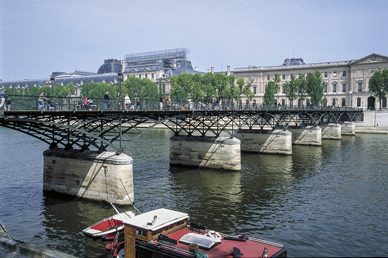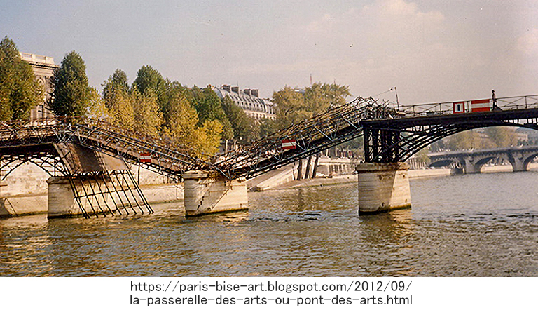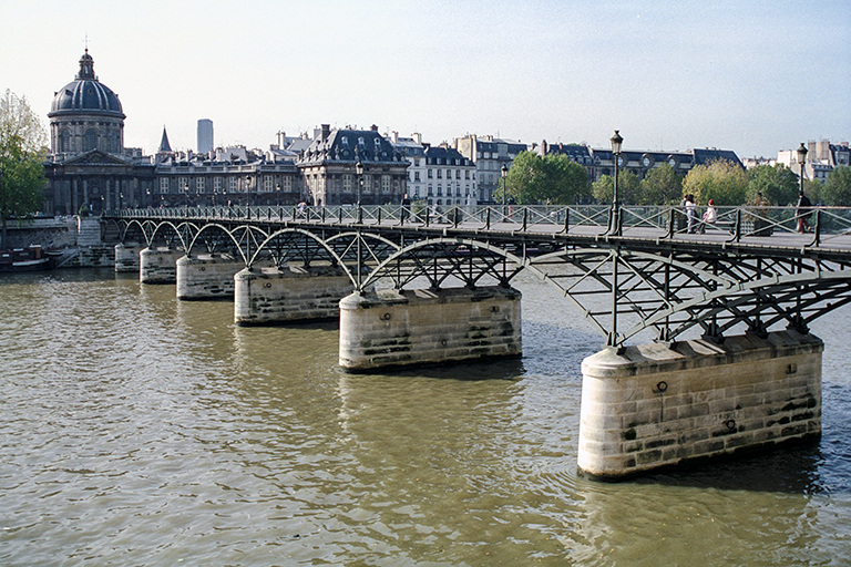 【世界遺産】ルーブル美術館の前に架かることから、ポン・デ・ザール(芸術橋)と命名された橋は、1801~04年にかけて、パリ初の鉄の橋として、鋳鉄を使った上路の9スパンのアーチ橋として作られた。設計はルイ=アレクサンドル・ド・セサール(Louis-Alexandre de Cessart)とその弟子。1852年に左岸側にあるフランス学士院の前の道路拡幅のため、スパンは9から8に減った。19~20世紀にかけての画家シニャック(Paul Victor Jules Signac)が描いたポン・デ・ザールの絵を1枚目に示す。このパリ初の鉄の橋のスパンは18.5m。セーヌ川の古い橋で、下流側から、コンコルド橋(1791年)最大31m、ロワイヤル橋(1689年)最大23.5m、ポン=ヌフ(1606年)最大16.4m、マリー橋(1635年)最大18mなので、一番狭い訳ではない。なのに、1961、1970、1979年と何度も船にぶつけられ(他の橋もぶつけられたかもしれないが、石造なので壊れるのは船の方)、特に最後の1979年のはしけとの衝突では、橋は大きく崩落した(2枚目の写真)。これを踏まえてパリ市はどうしたか? そこが素晴らしいところなのだが、永年市民に親しまれてきた橋の外観を変えずに、衝突の可能性を減らす方法として、8スパンでも7スパンでも「違う」という感じを与えないことを利用し(シニャックの8スパンの絵と、3枚目の正面から撮った7スパンの写真(Wikipedia)とを比べても違いは分からない)、アーチを7スパンに減らし、鋳鉄の代わりに強度の高い鋼鉄を使い、石の橋脚は、鉄筋コンクリートを石で覆うことで外観を変えずに新しい橋を架けた(1982~84年)。設計は建築家のルイ・アレチュ(Louis Arretche)。新橋のスパンは約22mと5橋の中で最小ではなくなった。なお、歩行者が通るデッキも初代と同じ木造としたが、材料には、腐食に非常に強いボンゴシ材を使用した。これは、私がずっと昔、国の重要文化財の桃介橋の全面改修を行った時、重要部分にボンゴシ材を使用したのと同じ発想だ。4枚目の写真は、ルーブルから学士院側を撮ったもの。5枚目の写真は、逆に学士院からルーブル側を撮ったもの。