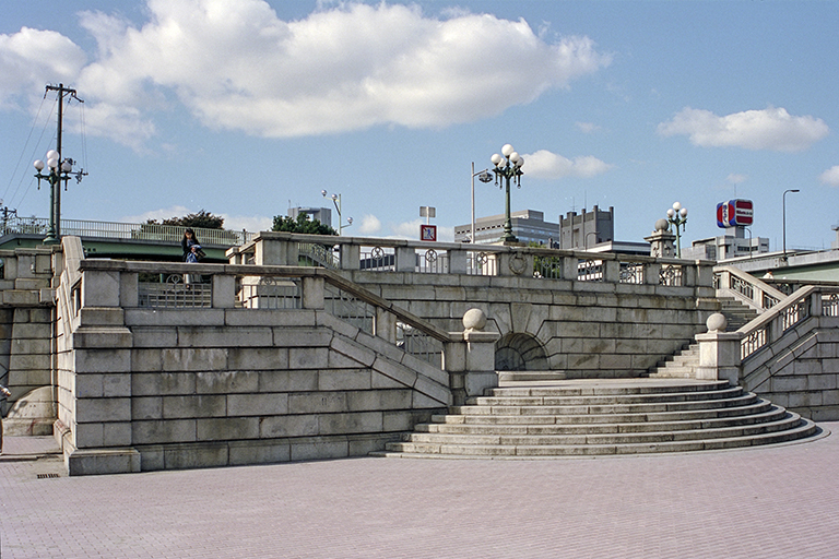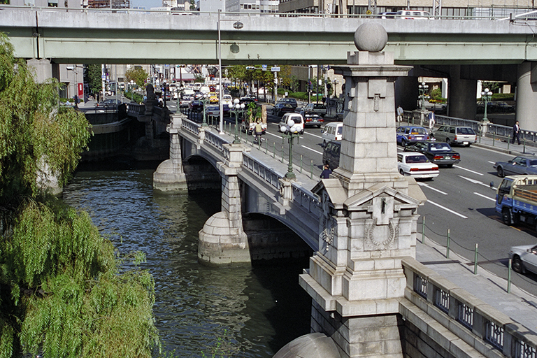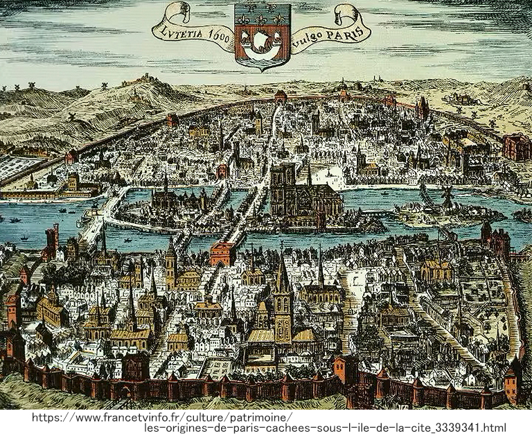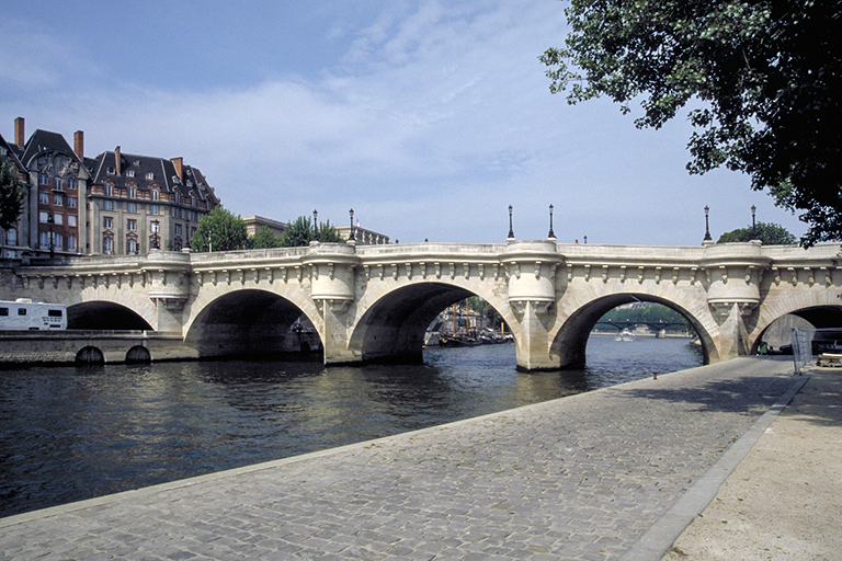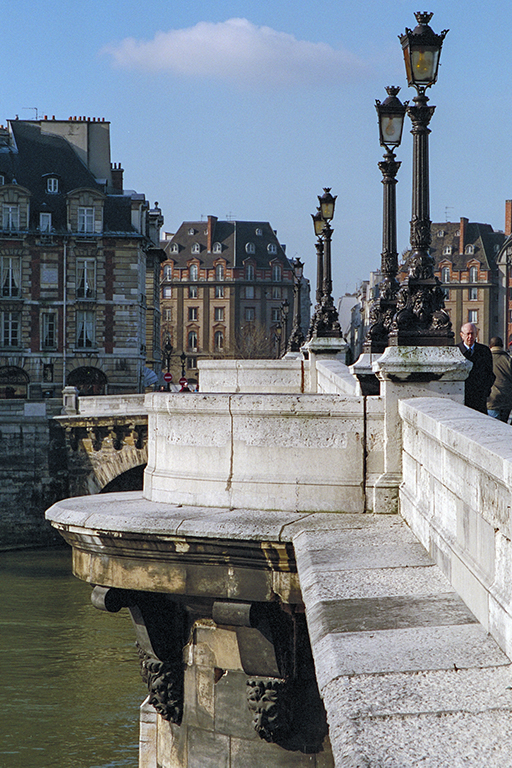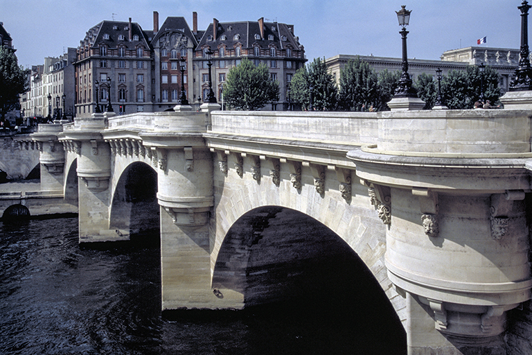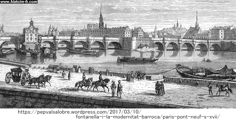 【世界遺産】ポン=ヌフは、1578~1607年にかけて作られた現存するパリ最古の橋。ここで、パリの橋の歴史を少し見て行こう。17世紀までパリの中心はシテ島で、そこには木橋が9世紀から架けられていた。パリ最古の石アーチ橋は、1280年の洪水の後に、シテ島の北側に架けられた「大きな橋」(Grand-Pont)。14世紀には、島内の両替商が集まる場所に「両替商の橋」(Pont-aux-Changeurs)が架けられ、1621年の火災の後、1647年にNo.45のシャンジュ橋(Pont au Change)として再建された。No.46のサン=ミシェル橋は、1379~87年に石アーチ橋として架けられ、1408年の洪水で流された後は木造で再建され、石アーチに戻されたのは1623年でポン=ヌフ以降。No.47のノートル=ダム橋は、木造橋が崩壊した後、1501~12年にかけて石アーチ橋として再建された。ポン=ヌフが完成した時点では、リストに入っていない「小橋」(Le Petit-Pont)を含め、既に4つの石アーチ橋が架かっていたので、その時点でポン=ヌフは5番目の石アーチ橋。下の絵は1600年のシテ島を描いた絵。工事中のポン=ヌフを含めて5つの橋が描かれている。ならば、なぜポン=ヌフは、「新しい橋」という名が付いたのか? ①それまでの橋は、シテ島とセーヌ川の対岸を結ぶだけで、セーヌ川の左岸と右岸を直結する橋は、ポン=ヌフが初めてだった。②それまでの橋が、歩行者と馬、家畜の牽く荷車が混在して橋を渡っていたが、ポン=ヌフで初めて歩道が設けられた。③そして、何よりも、それまでの橋は、橋の上に4階建て(フランス式に言えば3階建て)の家が並んでいたが、ポン=ヌフには家がなかった。「最初」が3つも重なったことから、場所や関係者の名前ではなく、「新しい橋」という名前が付けられた。ポン=ヌフの高欄のモールディングの下には、マスカロン(mascaron、仮面飾り、ポン=ヌフでは古代神話の森と野の神々)を使った持ち送り(381個)が付いているが、その理由として、❶住民を悪霊から守るため、❷幸運と成功への祈願、と二通りの解釈が書いてあったが、マスカロンの顔の醜さから推定すると、❶のような気がする。