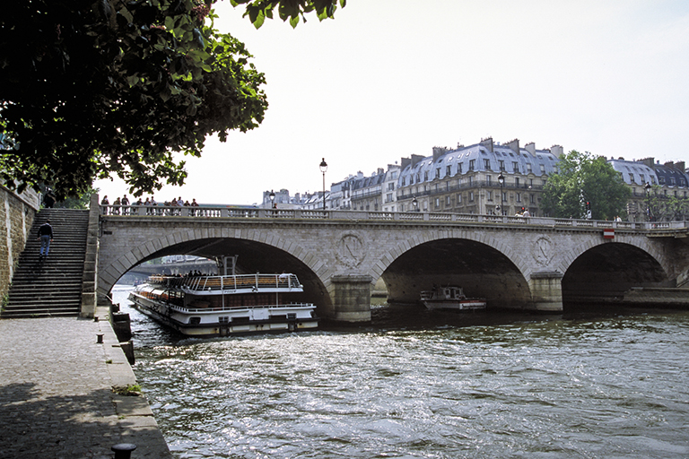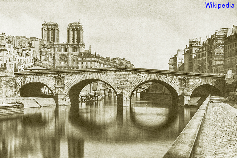 は、シテ島と南側(セーヌ川の左岸)を結ぶ橋。1379~87年に石造橋が作られ、シテ島とセーヌ川の両岸がつながった。1407~08年の冬に セーヌ川の巨大な氷塊で崩壊し、1408年 すぐ木製で再建された。1枚目のカラフルな細密画は1452~60年頃に描かれたもの(絵の一部)。この橋も1547年の洪水で破壊されたが、同年中に木造で再建。1616~23年には石アーチ橋に架け替えられ、当時の習わしで橋の上には家が並んだが、1786年の王令で撤去され、2枚目の古写真(1857年に撮影)のようになった(橋台上の装飾は、同時期に作られて現存しているマリー橋と同じ)。現在の橋は、オスマンの計画に従い、北のシャンジュ橋とほぼ同時に架け替えられた(1857年)。長さ62m、スパン17mのバスケットハンドル・アーチ3個の石アーチ橋で、外観もシャンジュ橋そっくり(3枚目の写真)。