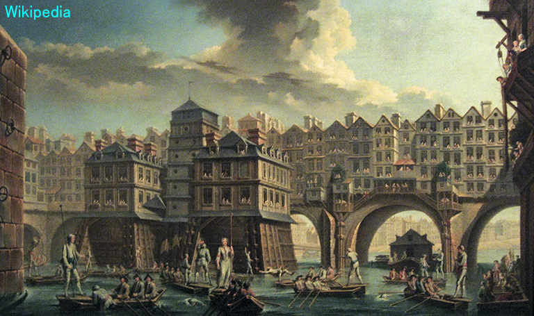 は、古い歴史を持つ橋。1501~12 年の間に石アーチ橋として再建され、その上に30軒の石造りの家と商店が2列に並んだ(1枚目の絵)。しかし、1786年の王令で家屋はすべて撤去された(2枚目の写真は、その直後)。橋はそのまま使い続けられたが、1853年になると、同じ基礎の上に 新しいデザインの橋脚を建て、新たな石アーチ橋が作られた(1853年の新橋の古写真を3枚目に示す)。