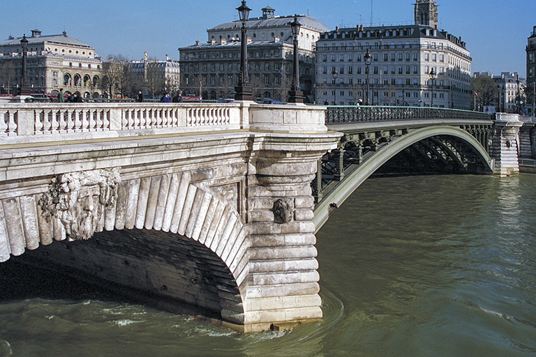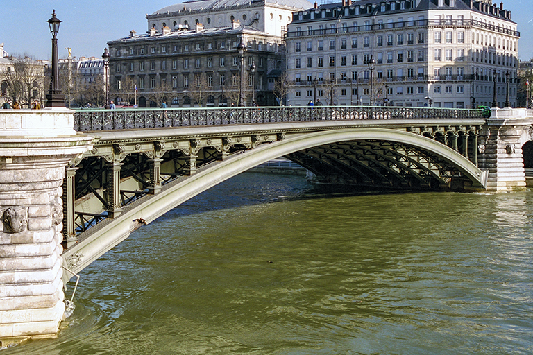 この1853年の新橋の失敗は、1512年の旧橋の基礎をそのまま使ったこと。その上に建てられた橋脚は、その時点でのセーヌ川の流れと一致しなかったため、何度も船がぶつかる事故が起きた。そこで、5スパンあるアーチのうち、両端の2つを残し、真ん中の3つを壊し、代わりにスパン59.5mの鋼アーチを架けることが決まり、アレクサンドル3世橋を手掛けた超一流の橋梁技術者ジャン・レザル(Jean Résal)が設計を担当した(完成は1912年)。形式は普通の上路の開腹アーチ橋だが、アーチと桁をつなぐ垂直材の上下と、高欄に鋳鉄を使ったきめ細かな装飾が施され、アレクサンドル3世橋に負けず劣らずといった感じの出来栄え。1枚目の写真は、1853年の石アーチと1912年の鋼アーチの両方を撮ったもの。2枚目の写真は、鋼アーチのみを撮ったもの。3枚目の写真は、https://paris1900.lartnouveau.com/ponts/ のサイトから、繊細な装飾のクローズアップ写真を掲載したもの。