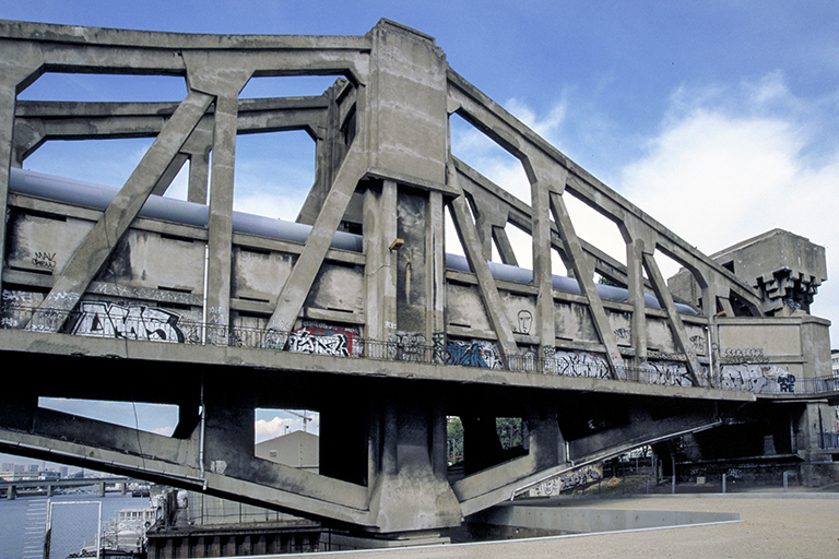 は、送電用の電気ケーブルを通す目的で設計された。1926年、この計画は、パリのメトロポリタン鉄道会社、パリ配電会社(CPDE)、パリ電気会社、セーヌ電気会社(現・イヴリー発電所)、ユニオン電気会社という5つの大企業の取締役によって提案された。彼らは、自己負担で橋を建設し、それを県に譲渡し、使用権のみを保持することを望んだ。セーヌ県はコンペを開催し、圧倒的に安値で落札したソシエテ・ジェネラル会社(Société générale d’entreprises、現在のSGE、世界第2位の建設会社)は、シャルロ(Charlot)の設計による鉄筋コンクリート製のカンチレバートラス橋という前代未聞で、以後も他に例のない構造形式で作られた。橋の上層部には2階建てのパイプライン用の箱が設けられ、下層の両端は歩道橋として一般に開放された。橋の長さは214m、中央スパンは134.6mもある。1枚目は正面から撮った写真と設計図を対比して示したもの。2枚目の写真は、右岸上流側から撮ったもの。3枚目の写真は、橋脚の部分を撮ったもので、2層になったボックスの上に、さらに、最初にはなかったパイプが通してある。歩道は、一番下の水平に桁が通っている部分で 落書きが一杯してある。4枚目の写真は、歩道の様子を撮ったもの。あまり広いようには見えない(これで自転車が通れる?)。