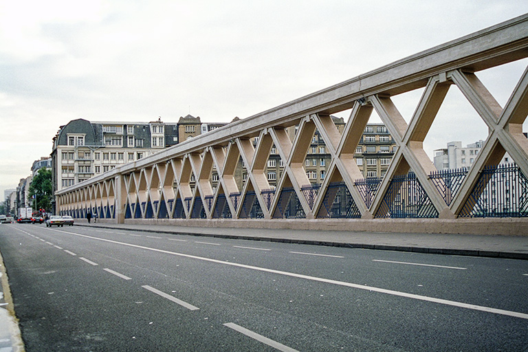 東駅(Gare de l'Est)のすぐ北には、ラファイエット通りがあり、そこには1882年に架けられた長さ79mの橋があったのだが、20世紀に入ってからの鉄道路線の急拡大(16→30)により、線路の増加が必要となり、橋がネックとなった。そこで、①鉄道の運行を妨げない、②ラファイエット通りの交通遮断を可能な限り短くする、という条件で橋を架け替える必要が生じた。当時、鉄筋コンクリートの設計事務所Pelnard-Considère & Caquotの所長だったアルベール・カコー(Albert Caquot)は、独創的な解決策を提案する。それは、旧橋の橋台を利用して、2スパンの全く新しい橋を架けるという案。その橋は、これまで誰も試みなかった鉄筋コンクリートで出来たダブルワーレントラス橋だった。この案に対し、公共事業省の鉄道局はセーヌ県知事に、❶形式に対する疑問、❷施工に対する不安を示唆するが、翌1928年には航空省の技術部長になるほど高い評価を得ていたカコーの案はそのまま了承された。ラファイエット通りの交通は、1927年6月16日~28年9月3日の間だけ遮断され、翌月の10月20日にはもう開通式を迎える。この形式の橋は二度と架けられなかったので、世界で唯一の貴重な存在だ。1枚目の写真は、多くの路線を跨ぐ