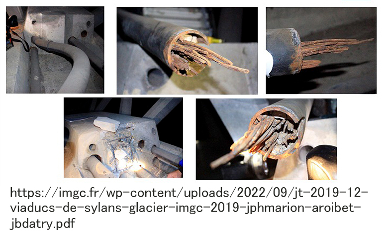 美しきシラン高架橋は、完成から34年後の2015年11月、外部ケーブルの1本が突然断裂するという事故に見舞われた。翌月新ケーブルに交換されたが、その後 徹底的な原因究明が行われ、破断の原因は下部での浸水による2ヶ所の損傷と、上部のカバーの損傷と判明。側面がトラスで雨や雪が吹き込み、それが溶接の不良個所や、カバーの亀裂から入り込み、結果的にケーブルの腐食を招いた。その対策として、①グラシエール高架橋とシラン高架橋の即時全面点検、②今後の定期検診(毎月、その後2ヶ月ごと)、③より耐久性のあるケーブルへの順次交換が決まった。下の写真は、下に記載されているサイトから取得した 「最初に破断が見つかった時」 の様子。