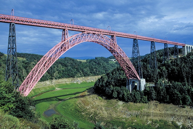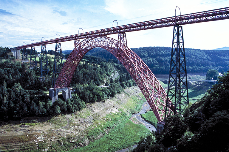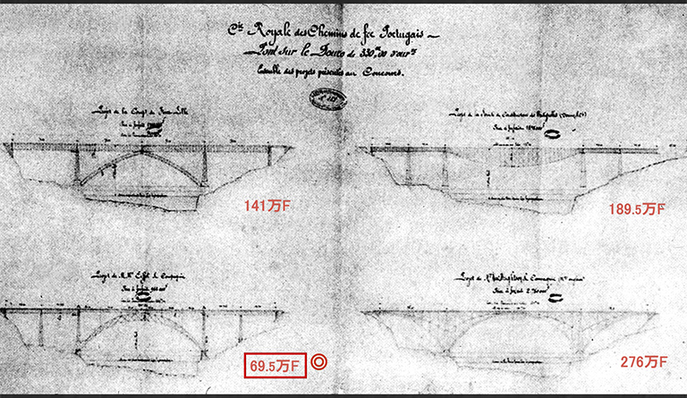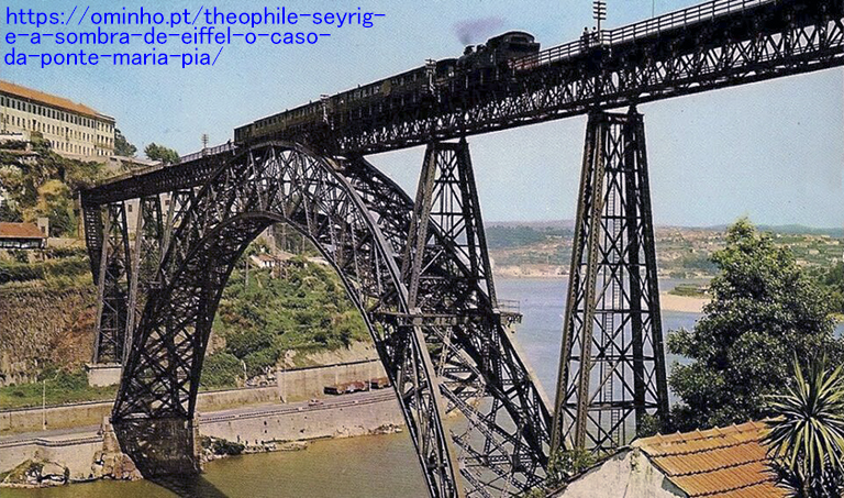 エッフェル社(エッフェル35歳のとき設立)が手がけたシウール川のルーザ鉄道橋 (Viaduc de Rouzat、1871年)では、トラス桁をトラスの鉄塔で支えるという構造が採用された(1枚目の写真、借用)。その後、ポルトガルのポルトの街でドーロ川を跨ぐ「スパン160mの当時最大の鉄道橋」のコンペ(1875年)では、エッフェル社の考案した構造形式の橋(中央に鉄を組んで作った巨大なアーチを立ち上げ、その前後のトラス桁は、ルーザ鉄道橋のようにトラスの鉄塔で支えた)が、他社の半額以下という建設費で勝利した(2枚目の図)。設計の陰の功労者は共同出資者のセーリグ(Théophile Seyrig)技師だったが、エッフェルはそれを公表しないまま、橋は1877年に完成した。ポルトには行ったことがないので、他のサイトの写真を3枚目に掲載する。エッフェル社は、1884年に、このドナ・マリア・ピーア(Dona Maria Pia)鉄道橋を凌ぐ スパン165mの
