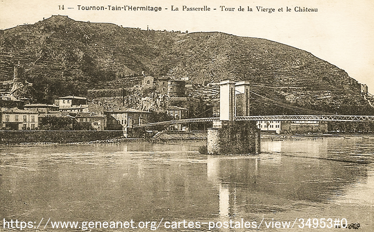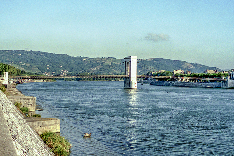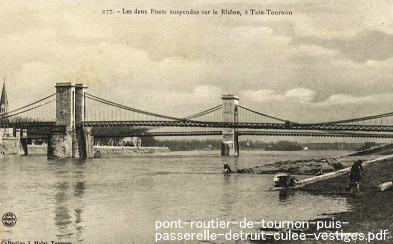 として残っている。1枚目の写真は、フランスのこうした考え方に抗議して、2代目の吊橋の遠景だけ掲載する。代わりに、当時の絵葉書で変遷を示しておこう。2枚目は1825年の吊橋、3枚目は、1825年の吊橋と、マルク・スガンが架けた2代目の吊橋が並んで写っているもの。4枚目は、入口に階段を付けて嵩上げされた1825年の吊橋。
