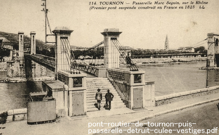 産業革命の先進国イギリスでは、1820年に鉄の鎖を使ったユニオン吊橋が架けられて以後、時代の寵児だったテルフォードが、コンウィ吊橋 (1826年)、メナイ吊橋(1826年、スパン176m)と鉄の鎖を使った吊橋を普及させていった。一方、フランスでは、マルク・スガン (Marc Seguin)が、1825年に、現在の吊橋の原点となるワイヤーを使った吊橋(スパン85m×2)をトゥルノン=シュル=ローヌのローヌ川に自費で架けた(99年分の通行料の代わりに)。イギリスの記念すべき橋はほとんどすべて現存しているのに、世界初の実用的ワイヤー吊橋は、フランス的合理主義により、その後ひどい目に遭った。まず、ローヌ川を蒸気船が通るようになると、川面から近い吊橋は嵩上げを要求され、入口に階段を付けたため、歩道橋となり、マルク・スガンは最初の吊橋の100m下流に、1849年に道路交通用として、もう一つの吊橋を架けた。そして、1965年4月25日、世界初のワイヤー式吊橋は “河川航行を容易にする” というだけの理由で、安易に解体された。幸い、マルク・スガンの架けた1849年の橋は、