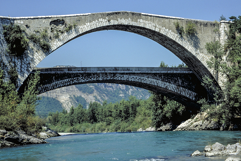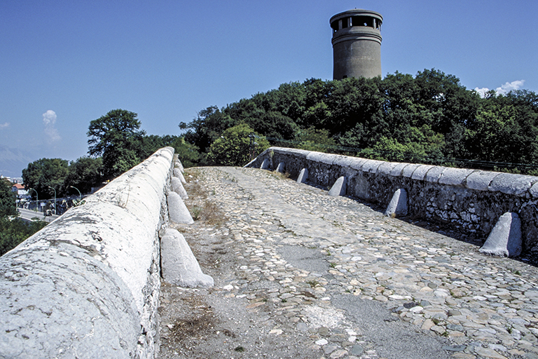 レディゲール橋は、クレー(Claix)の町の境界になっているドラック(Drac)川を跨ぐスパン45.65mの石アーチ橋。旧ドーフィネ州のレディゲール(François de Bonne de Lesdiguières)中将の指示により1611年に作られた。橋の名前も、中将の名前から来ている。19世紀後半、古くなった橋がドラッグ川の水面から約16m上に聳えていて通行に不便が生じたため、1873年に水平で低い橋が、レディゲール橋にぴったりくっつくように作られた。1枚目の写真を見ると、少しは距離があるように見えるが、実際にはほとんど隙間はない。それでも、新橋の設計者は扁平なアーチ部分にレディゲール橋と同じ白くて小さな石を張り付け、高欄の下には白い石を水平に並べ、下流側から見た時に一種の統一感を与えるだけの配慮はしたようだ。レディゲール橋は、1898年に歴史的建造物に指定されているが、写真から分かるように、維持管理が十分にされているとはとても思えない。2枚目の写真は、橋への登り口。3枚目の写真からは、橋の上の路面のひどさ、小石が乱雑に敷き詰められていて足がつまずきそうで危険な状態がよく分かる。