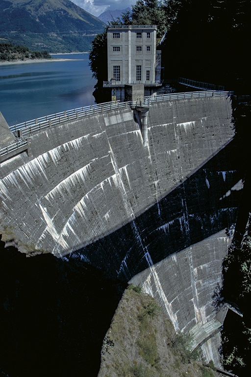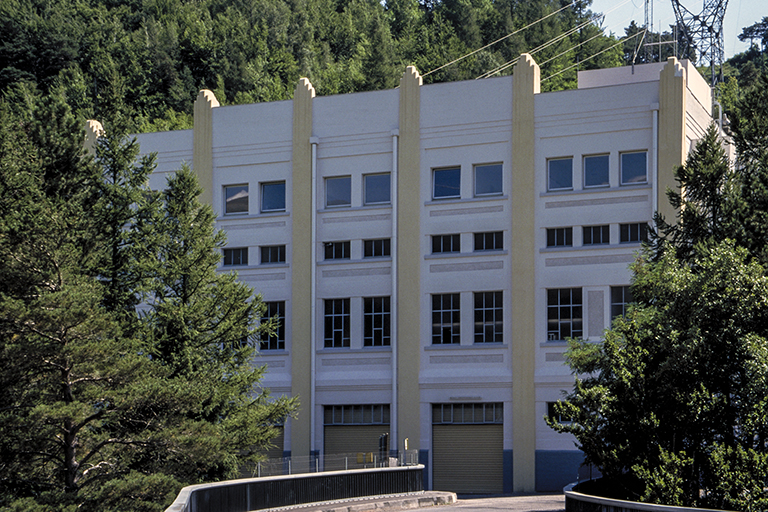 ソテ・ダムの建設が始まった。ダムは全高126m、堤長80mと縦に長く、標高765mに水を貯める構造だった。ダムの右側の渓谷の壁が高い圧力を受けるため、防水性を確保するため、岩の中にセメントが注入され石灰岩を強化した。ダムの形式はアーチ重力式。完成は1935年。発電所はダムの左側の岩山を削って建てられ、半分は地表に、半分は地下36mにあり、最大出力は6万7500kW(日本で一番有名な黒部第二発電所は7万2000kW)。1枚目の写真は、ダムの全景と貯水池の一部。ダム背後の邪魔な建物は、景観上、別の場所に建てればよかったのにと思う。2枚目の写真は発電所。黄色の柱が上部で ”中央が高い3段“ になっているのは、典型的なアール・デコ様式。