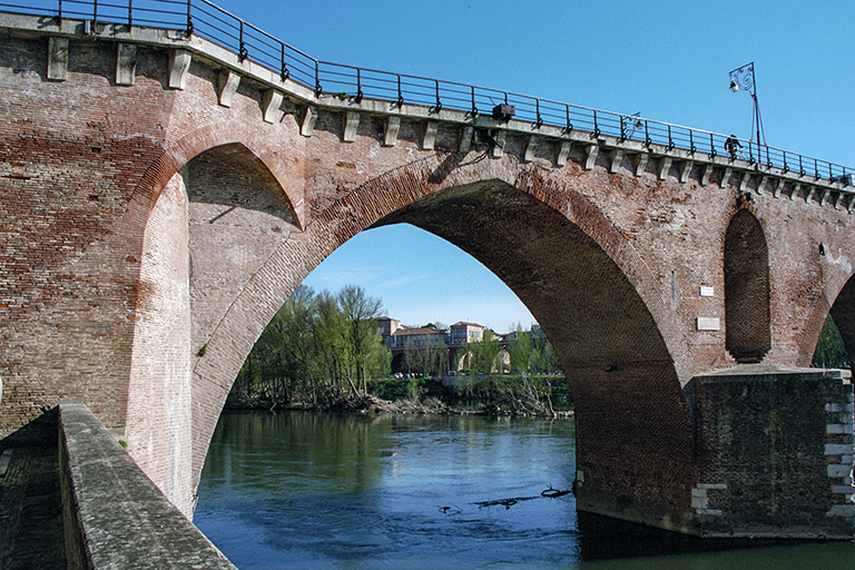 ヴュー橋は、町の中心でタルン川を渡る。長さは205m。スパン21.38~22.75mとすべて大きさが異なる尖頭アーチが7つ並ぶ煉瓦橋(この地域は、石材の入手が困難なため、近くの中核都市トゥールーズでも煉瓦橋が作られた)。橋脚前後の尖った三角は洪水時の急流から橋を保護するため。橋脚上の開口部は、増水時に水を流して橋の上流側の水位を下げるため。ヴュー橋は1830年に拡幅されたが、橋そのものの外観は変えず、橋本体の上に張り出し式の歩道を付け、それをモールディングで支えるという洒落た手法が採用された。「歴史的建造物」指定は1911年。1枚目の写真は、上流側から全景を撮ったもの。中央の橋脚に洪水時に上流から流れてきた木材がひっかかっている。2枚目の写真は、拡幅の様子を近くから撮ったもの。