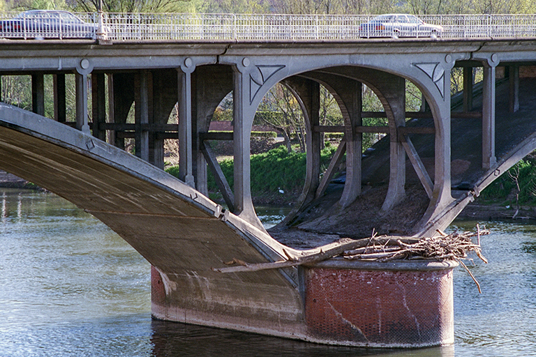 ポン=ヌフの完成は1912年。1枚目の写真は、その全景だが、橋脚の上に巨大な “穴” が開いている構造に驚かされる。その理由は、「タルン川の特徴の一つは、その水位の高さにある。12時間で6mも増水し、渇水時からは10mの高さに達する。そのため、水の流れを妨げないよう、透過性の高い構造にする必要があった」から。2枚目の写真は、中央の橋脚を拡大したもの。大きな “穴” の四隅は内部も含めて曲線になっていて、上部の角には装飾も入っている。機能とデザインの素晴らしい形での調和だ。ここでも、上流からの材木が大量に乗っているが、橋台の先端にはヴュー橋に合わせて煉瓦が張ってある。この新橋も、2005年に「歴史的建造物」になった。