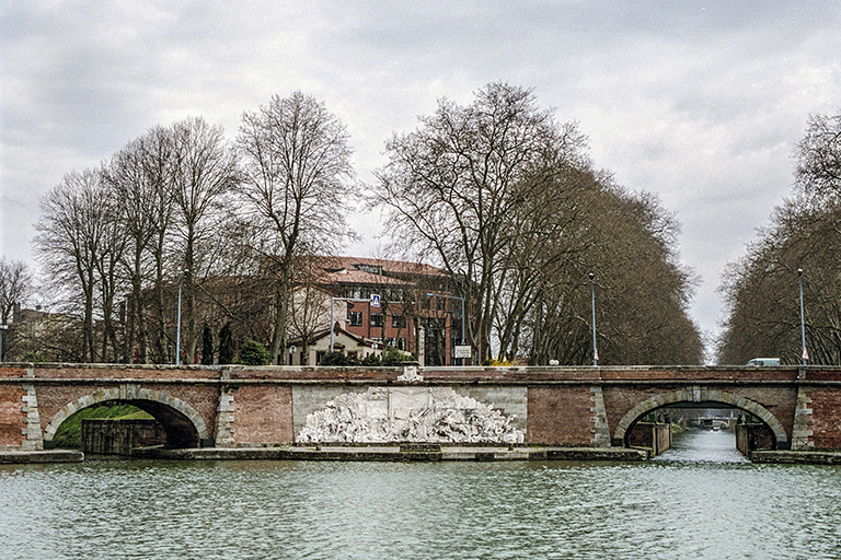 ランブシュール港。その東端には、3つの運河への入口が並んでいる。1枚目の写真では、左からガロンヌ運河、ミディ運河、ブリエンヌ運河の順。そして、それらを一体化するように煉瓦で覆われた部分を、ジュモー橋(Ponts-Jumeaux)と呼んでいる。Jumeauxは双子という意味なのに、なぜ3つなのか? それは、ピエール=ポール・リケ(Pierre-Paul Riquet)が全力を尽くし、彼の死後8ヶ月の1681年5月にラングドック運河(1789 年にミディ運河と改名)が開通した時には、この運河はトゥールーズと地中海を結ぶもので、ビスケー湾(大西洋)とは運河ではなくガロンヌ川を使うという方針だったから。ランブシュール港が作られた目的は、ラングドック運河を通って地中海から来た船を、すぐ近くを流れるガロンヌ川までブリエンヌ運河(長さ1560m)を通って行かせるための回転場。その時は、出入口は2つしかなかったので、「双子」と名付けられた。2枚目の写真には、2つの出入口の中間に、白い大理石を刻んだフランソワ・リュカ(François Lucas)の大レリーフ(1776年)が映っている。話は戻り、なぜガロンヌ川では駄目でガロンヌ運河が必要だったのか? この川の流量は非常に不規則で、春は洪水、夏は低水位が発生する上に、トゥールーズやモワサックなど特定の場所では元々川底が浅かった。従って、ガロンヌ川の航行には大きな危険が伴った。1681 年、ミディ運河が開通した際、引き続きボルドー市に向かおうとすると、トゥールーズで、ミディ運河の船の荷をより小さい船に積み替える必要があった。それに、ガロンヌ川をボルドーに向かって下るには 平均5 日が必要で、特に反対方向に戻ってくるには 平均15 日かかった。ミディ運河の方も5日が必要だったが、運河の水面は水平なので、上りも下りも5日だった。こうした状況は、フランスに産業革命の時代が到来すると、ガロンヌ川の側方運河の必要性が主張されるようになる。トゥールーズを経由してボルドーと地中海を結ぶ鉄道が1858 年に完成するが、ガロンヌ運河は、その僅か2年前の1856年に開通した。初期の鉄道と運河とは運ぶ物の量や重さに違いがあったので、経営は十分成り立ったのであろう。因みに、ジュモー橋は、この時に延長され、3つの運河を包むように整備された。