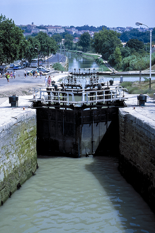【世界遺産】運河は水平でも、西端のトゥールーズと地中海の間には189mの標高差があるので、それを克服するために130ヶ所の閘門が設けられた。その中で一番有名なのが、8基の閘門で21.5mの標高差を運行可能にした