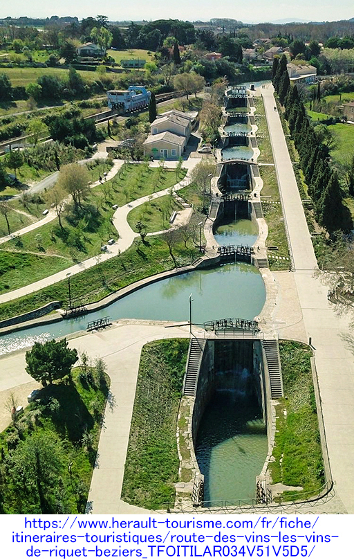 フォンセラーヌ閘門。ラングドック運河を発案し、国王の財政総監コルベールに提案し、ルイ14世の建設法令が1664年に出されると、運河の建設を自己費用で請け負った “ラングドック運河の統治者” ピエール=ポール・リケ(Pierre-Paul Riquet)が最も力を入れた構造物の一つ(ラングドック運河は、1789 年にミディ運河と改名された)。1枚しかない写真は8段の途中から下方を撮影したもの。せっかくの世界遺産なので、旅行会社のページにあった航空写真を1枚添付する。