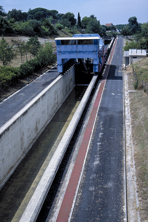フォンセラーヌの傾斜水路。1枚目の写真で斜路の様子、2枚目の写真で運搬装置の拡大写真を示す。それらを見れば、モンテシュの傾斜水路とは全く違うことが分かる。モンテシュで成功したのに、なぜ全く変えてしまったのか? しかも、それがより優れた成功につながれば良いのだが、フォンセラーヌの傾斜水路は、自走式の巨大な装置があまりに複雑なため巧く機能せず、使用は諦め、そのまま放置されている。