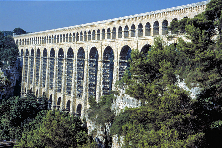 ロクファブール水道橋は、世界で最も高い(82.65m)石造の水道橋。1833~34年の干ばつによる給水制限を受け、マルセイユ市長のマクシマン・ドミニク・コンソラ(Maximin Dominique Consolat)は、デュランス(Durance)川からマルセイユに水を送る長さ80kmの水路の建設を決めた。その計画の最大の難関は、アルク(Arc) 渓谷。市長は、計画案の作成を技師のジャン・フランソワ・マヨール・ドゥ・モントリシェール(Jean François Mayor de Montricher)に依頼し、彼の “サイフォンを使わず水路橋を建設する案” を、多額の経費を要するにもかかわらず了承した。その結果、1847年に完成したロクファブール水道橋は、長さ393m、ガール水道橋を意識した3段構成の石造アーチ。1段目は高さ34.10m、スパン15mの半円アーチが12連、2段目は高さ37.60m、スパン16mの半円アーチが15連、3段目は高さ10.95m、スパン5mの半円アーチが53連と、樹木に埋もれた1段目より、遠くから見える2段目を重視する構造となった。水道橋は細部のデザインにも凝っていて、最上部にはモールディングを連続させ、1・2段目の橋脚の側面には一定間隔で石を張り出させてアクセントを付けるなど、水道橋としては例外的に華麗な構造物となった。3段目にはガール橋のような水路ではなく鉄管が敷設されたが、時代による変化に合わせて増設され、今ではマルセイユの水道の80%をまかなう貴重な存在。なお、橋の大規模な修復は2020~24年にかけて行われた。1枚目の写真は遠景で、水道橋の美しさが全く分からない。2枚目の写真で、ロクファブール水道橋の素晴らしさがよく分かる。3枚目の写真は、より近くから撮ったもの(当時のメモには、「トゲトゲの葉の茂る斜面の僅かな踏み跡を無理矢理登りつめて、橋を斜めに見上げる絶好のポイントまでやっとの思いで辿り着いた。汗が噴き出る。そのくらい暑い。快晴。文句を言う筋合いではないが、とにかく暑い」と書いてある。教会や城と違い、こうした物を撮影するのは、大変なことだ)。