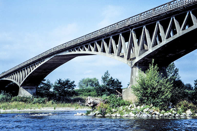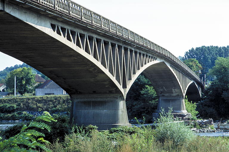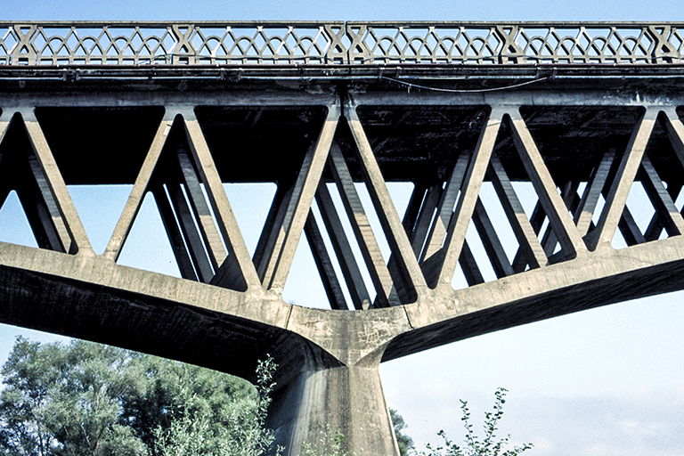 (1912年)。フレシネーが前年に架けたヴールドル橋(Pont du Veurdre)で、コンクリートを打ち終わってしばらくしてからアーチの中央が13cm下がっていることに気付き、水平にしようとジャッキで上げ、隙間にコンクリートを流し込んだ。これが、コンクリートには遅れて変形が現われる「クリープ現象」があることの世界初の発見。そこで、フレシネーは、翌年手掛けたブティロン橋では、予めそうした現象に対応できるよう、アーチの先端にジョンイントを設けた(これは一種のプレストレスで、PC橋の原点とも言える)。ブティロン橋はスパン67、72、67mの3連のアーチで、石や煉瓦の時代と異なり、路面とアーチの間にトラスがジグザグに組み込まれている。こうした変わった構造にした理由は、フレシネーがこのプロジェクトに対する入札を “低価格” で勝つための工夫(鋼橋の場合は、トラスを活用して鋼材を節約する方法が、鉄道橋の進化とともに、19世紀の半ばまでに確立していた)。フレシネーは、それを上手にRC構造に採用しただけ。フランスでは、他にも鉄筋コンクリートでトラスを作った例がある。1枚目の写真は、普通に撮ったブティロン橋。2枚目の写真は、この橋が如何に扁平であるかを示すために少し離れてより正面近くから撮ったもの。3枚目の写真は、逆に橋のすぐ近くの下から撮ったもの。中にトラスが入っていることで、見方によって表情が全く異なるのが面白い。4枚目の写真は、クローズアップだが、高覧のデザインも、アーチとトラスが組み合されている。ブティロン橋は、2021年に「歴史的建造物(Mimument histoque)」に指定された。