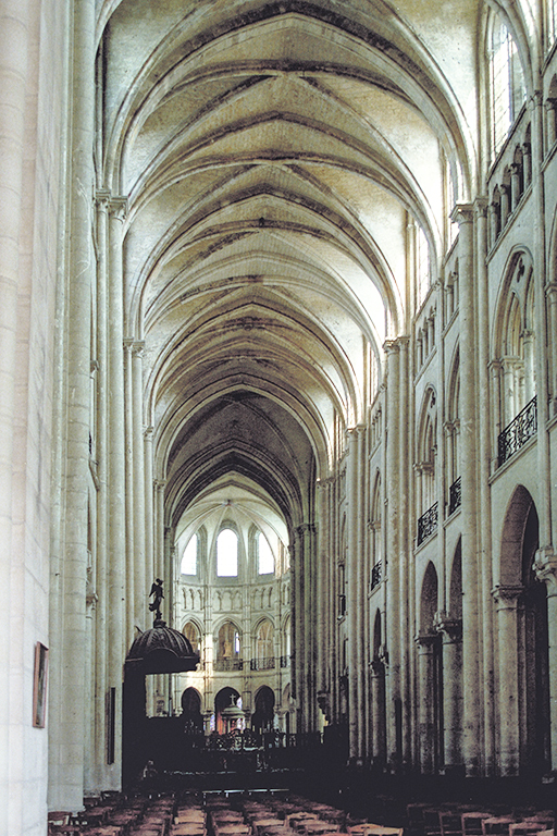 ノワイヨンのノートル=ダム大聖堂は、ゴシック様式の黎明期、1145年に後陣(内陣の奥の半円部分)から工事が始まり、内陣の建設は1160~70年頃、身廊の建設は1185~1230年代。2つの鐘楼を持つファサードの建設は1185~1231年。ほぼすべての工事が終わったのは1235年。身廊や翼廊の天井には交差リブの付いたヴォールトが初めて使われ、フランスで最初のゴシック様式の大聖堂として高い評価を受けている。ランス大聖堂の解説の時に、“初期の事例” として使用したラン(Laon)の大聖堂は1150~1235年と完成年は同じだが着工は5年遅い。因みに身廊の天井高は、ノワイヨンが22.73mで、ランは24m。ノワイヨンは、ファサードの鐘楼は左右ほぼ同じ形のものが並んでいて、ランス大聖堂に匹敵する。ただ、非常に残念なことに、鐘楼には近世的な四角錐のスレート屋根が乗っていて中世の教会のイメージを壊している。この屋根は、1765年に架けられたもの。鐘楼のその他の部分は創建時のままなので、バカなことをしたものだ(私が探したWEB上の中には、どこにもこのことは書いてなかった。変だと思って探した結果、「Histoire de la cathédrale de Noyon (suite et fin)」という1900年に出版された本の283ページに、1765年の改修に関する記載があった)。1枚目の写真はファサードを撮ったもの。ゴシックの大聖堂に付きもののバラ窓がない(黎明期なので元々なかったのか、後で改修されたのかは不明)。2枚目の写真は、ファサードから入った所で身廊を撮ったもの。天井には確かに交差リブヴォールトが使われている。ステンドグラスは、フランス革命や第一次世界大戦中の爆撃で大きな被害を受けたので、聖堂の中は太陽の光線で明るい。