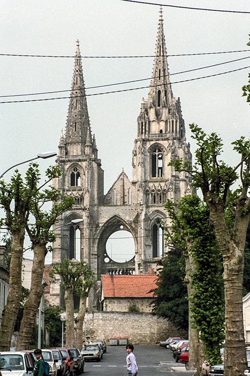サン=ジャン=デ=ヴィーニュ旧修道院の教会。塔は大聖堂と違って2塔あり、2塔とも大聖堂の塔より高くて立派だ。ファサード正面のバラ窓は、プロイセン軍の爆撃で破壊され(1870年)、大きな丸い穴になっている。そして、その向こうには身廊がないので、残っているのはファサードだけ。でも、私は、どこにでもある平凡な大聖堂より、見たことのない異形の、とても可哀想な修道院教会の方が100倍好きだ。
