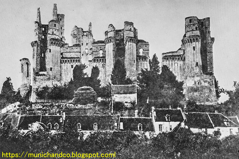 1枚目の写真は、西側から撮ったもので、左から、ゴドフロワ・ド・ブイヨン(エルサレム王国の初代君主)、アレキサンダー大王、アーサー王の塔。2枚目の写真は、ほぼ同じ角度から1855年に撮られた写真。批判はあっても、よくここまで復元できたものだ。3枚目の写真は、最も大きな2つの塔と、その塔の間に設けられた高い城壁を撮ったもの。4枚目は、図の上に長々と書いた資料にある図-13の転載。この城の絵は、1611 年にDuviertが描いた破壊される前のピエールフォン城(青い点線は、最も大きな2つの塔)。赤い長方形は資料の著者が描いたもので、そこに浅浮彫りの飾りがあることを示している。これを見た後で、3枚目の写真を見ると、同じ場所に浅浮彫りの飾りがちゃんと再現されている。5枚目の写真は、城の中の有名な中庭。ここで多くの映画が撮影されたとか。