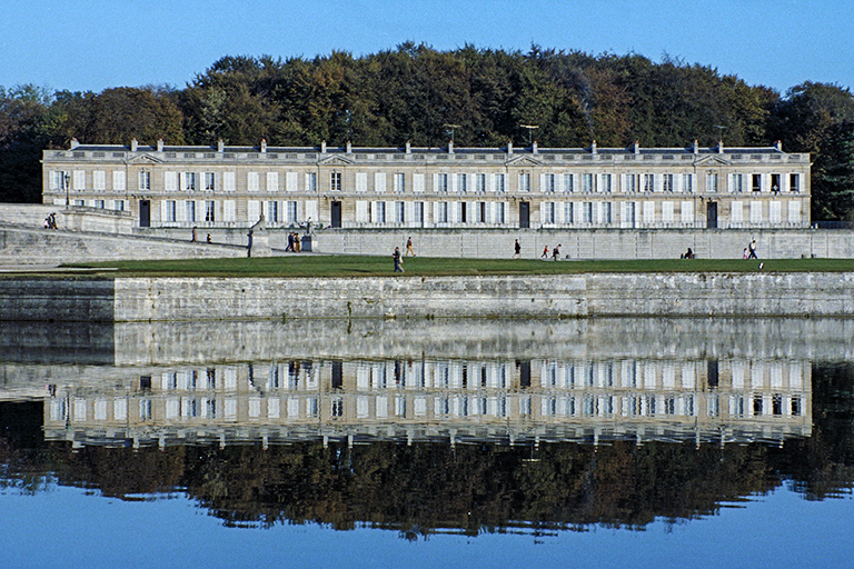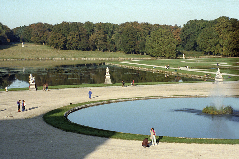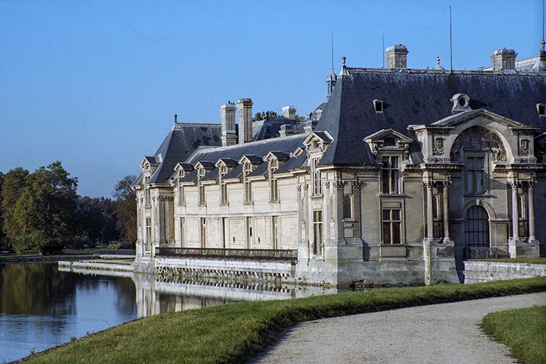 全体の構成を理解した上で、1枚目の写真はグラン・シャトーの入口。2枚目の写真はグラン・シャトーの南西側。3枚目の写真は私が一番好きな北西側。ともに、一種の水城だ。4枚目の写真は、シャンティイに招いた客人が泊まるアンギャン城。5枚目の写真は大厩舎。6枚目の写真は、グラン・シャトーの右のアクスのテラスから、その下の円形の池と、その向こうの入り込んだカナルと花壇の一部(右側)、そして、カナルの向こうの焦点の彫像を撮ったもの。写真は少し斜めからなので、その先に伸びるアクスは見えない。