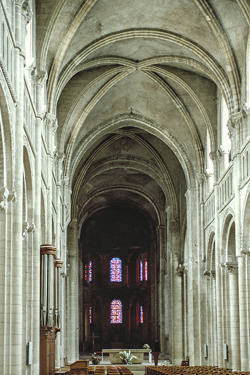 カーンのラ・トリニテ修道院教会は、別名、女性修道院(Abbaye-aux-Dames)。ノルマンディー公ウィリアム2世の妻、フランドルのマティルダ(Mathilde de Flandre)によって1060年頃に設立された。トリニティ教会は、夫の男性修道院の教会と違い、建設当時のロマネスク教会の雰囲気を色濃く残している。1枚目の写真は、ファサードと双塔。こちらの塔は、ゴシック様式の尖塔はなく、ロマネスク様式の塔と、その背後に、翼廊交差部の中央塔(ここだけ尖塔を追加)だけが見える。2枚目の写真は、身廊から内陣を撮ったもの。天井の高さが低い分、身廊の両側は3層構造でも、2層目は背が低く窓のないブラインド・アーケードになっている。天井の交差リブヴォールトが、男性修道院と同じ変わったスタイルになっているのは、同じ時に同じ設計で作られたから。男性修道院との大きな違いは、内陣がゴシック様式に改修されていないこと。