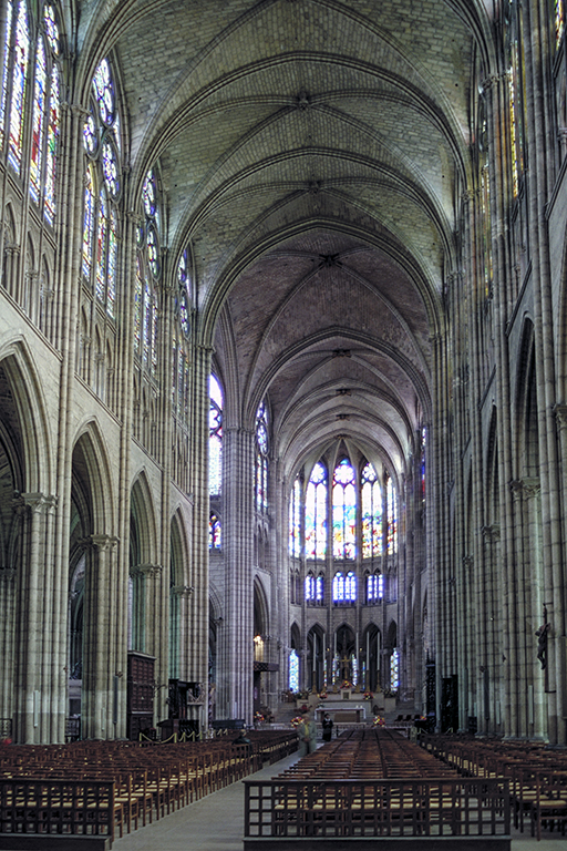 サン=ドゥニ大聖堂は、12世紀前半にサン=ドゥニの修道院長だったシュジェール(Suger)が、9世紀頃に作られた修道院の教会を改修して新しい教会を作ろうと考え、1136~51年にかけて、旧教会のファサードの西に新しいファサードを、旧教会の内陣の東に新しい内陣を建設し始めた。しかし、工事はシュジェールの死去で中断し、13世紀に入り、1231~81年にかけて身廊、翼廊、内陣の建設やシュジェールの構築部分の変更が行われ、ほぼ現在の姿に近づいた(身廊は3層で、天井高29m)。フランス革命が起きると1790年に修道院は廃止され、2年後に教区教会となった。そして、その翌年の1793年、王家の墓でもあったサン=ドゥニの元修道院に葬られていた42人の国王、32人の王妃、63人の王子などの遺灰が共同墓地に投げ込まれた。1813~79年にかけて修復工事が行われたが、その途中で、ファサードの北塔に落雷があり、その後の強風で亀裂が入ったため、1846 年に取り壊された。1枚目の写真は、南塔だけが残ったファサード。2枚目の写真は、南塔の下から身廊と南翼廊を撮ったもの。3枚目の写真は、身廊から内陣を撮ったもの。ステンドグラスのほとんどは19世紀のもの。