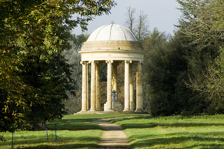 ⓫製粉所。2枚目の写真は、ビリヤードの家と王妃の家、左端に鳩小屋。3枚目の写真は、調理場とリネン室。4枚目の写真は、王妃の家の330m南にある愛の神殿(1778年)。12本のコリント式の柱で囲まれ、ドーム屋根を載せた古代ギリシャを想わせる建物。5枚目の写真は、参考までに半世紀以上前に作られたイングランドのストウ庭園(Stowe Gardens)のロトンド(Rotondo、1721年)。柱の数が12本か8本か、円柱の柱頭がコリント式かイオニア式か、中央に立っているのが、「ヘラクレスの棍棒で弓を作る愛の神」か「ヴィーナス」かが違っているだけの “定番構造物”。