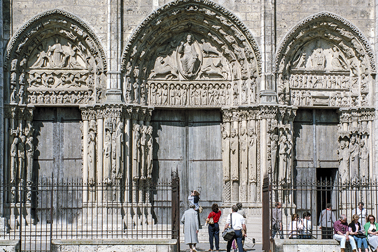【世界遺産】私がフランスで、パリ以外に何度も訪れた場所の一位が、シャルトルのノートルダム大聖堂。2回目は1回目の6年後、3回目はその5年後、4回目はその5年後。その後、10回以上海外に行っているが、すぐ近くを通った時も寄っていない。なぜかと言えば、シャルトルの唯一最大の魅力であるステンドグラスがどんどん汚れて 美しく澄んだ「シャルトル・ブルー」が見えなくなってしまったから。ここで用いた内部の写真は、3回目の時のもの。シャルトル大聖堂は、1194年の火災で破壊されたロマネスク様式の大聖堂の跡地に作られた。歴史上の火災(Les incendies dans l'histoire)というサイトを見ると、「意図された火災? ノートルダム・ド・シャルトル大聖堂のケース(Incendies programmés ? Le cas de la cathédrale Notre-Dame de Chartres)」という、アルノ・タンベール(Arnaud Timbert)による解説がある。その中でタンベールは、①火災は1194年6月10日に起きた。②火災の直後からゴシック様式でより多くの巡礼者を収容できるような大聖堂の建設が始まり(建設資材がすぐ調達できた)、早くも1226年には基本的な工事が完了した。③巡礼者にとって一番大切な「聖母マリアの肌着(la chemise de la Vierge)」が奇跡的に地下室から見つかった、などの状況から、古いロマネスク教会を建て替えるための人為的な火災だったという仮説を立てている。火災で唯一燃えなかったファサードの高さ103mの南塔(1150年)は別として、身廊と内陣は1210~15年にかけて作られた。身廊(天井の高さ37.50m)は、その後の、ランスやアミアンでも踏襲された3層構造(2層目は背が低く窓のないブラインド・アーケード)を使用。内陣は多くの巡礼者が入れるように二重の回廊とし、内陣の奥の後陣には礼拝堂(大3、小3)も設けられた。ファサードの北塔(高さ115m)だけは、1516年の完成と随分遅くなる。