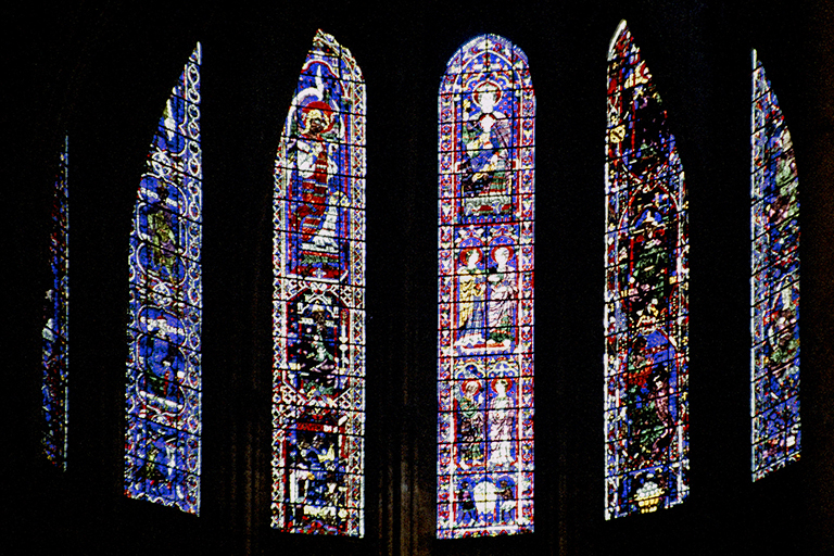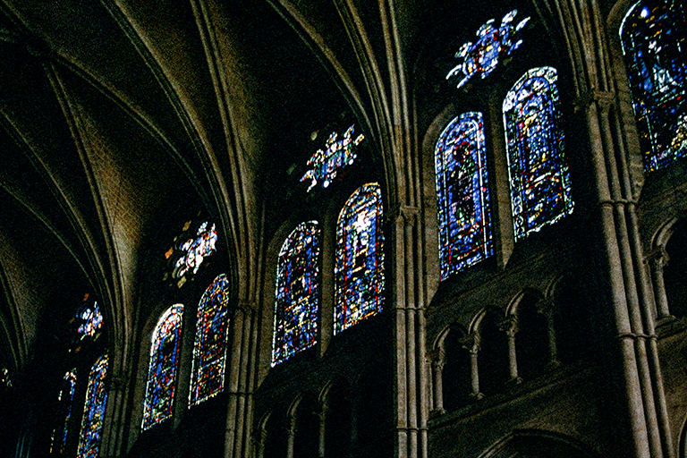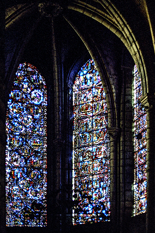 シャルトル大聖堂には戦争や革命を免れた12~13世紀のステンドグラス2600㎡が当時のまま残っている。これは、一番貴重な12~13世紀のステンドグラスとしては世界最大の規模で、シャルトルの最大の魅力。ステンドグラスの色の基調は紺色なので、「シャルトル・ブルー」と呼ばれている。最初に作られたのがファサードと翼廊のバラ窓(1225~30年)。すべてのステンドグランスの完成は1240年。奉献は1260年10月24日。