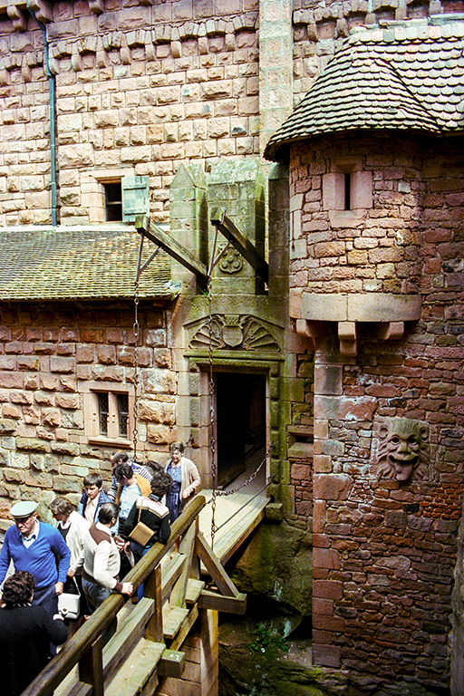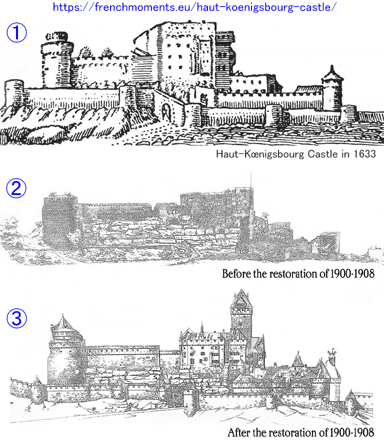 オー=ケニグスブール城(Château du Haut-Koenigsbourg)は、標高757mのヴォージュ山脈の東端にある要塞城。1147年の文書の中に、シュタウフェン城(Staufenberg)という名称が出て来るのが原点。13世紀にロレーヌ(Lorraine)公爵がその城を占拠した後は、持ち主が頻繁に変わる。15世紀になると、ティアシュタイン家(Thierstein)が2つの砲塔と強固な城壁を持つ要塞を建てる。17世紀の三十年戦争(プロテスタントとカトリックの衝突、封建主義と絶対主義の衝突)中、1633年にスウェーデン軍により城は占領・放火され、放棄されたまま19世紀に至る。普仏戦争(1870~71年)の結果、フランス領だったアルザスはドイツ帝国に割譲され、城の修復に熱心なヴィルヘルム2 世(Wilhelm II)の治世下で、ベルリンの建築家で城郭研究者のボド・エプハート(Bodo Ebhardt)が1900~08年にかけて城を修復した。エプハートの目標は城を1500年頃の状態に修復することだったが、詳しい資料がないので、勝手な解釈は最小限に抑えた手法が採用された。下の図①の1633年の城の絵(原典の図を拡大して、③と位置をほぼ合わせてある)、②の1900年の修復前の破壊された姿、③の1908年の修復後の姿の3枚を比べてみると、エプハートが①を参考に③に至ったらしことが類推できる。