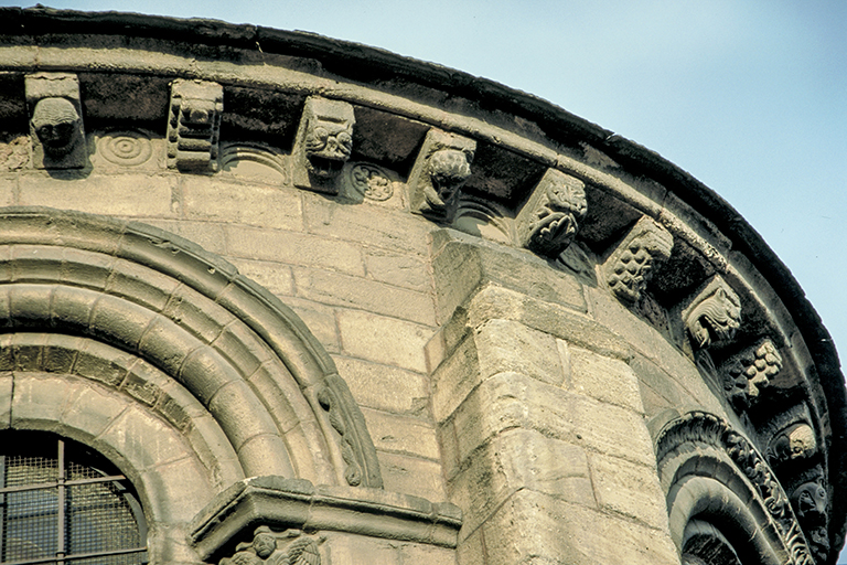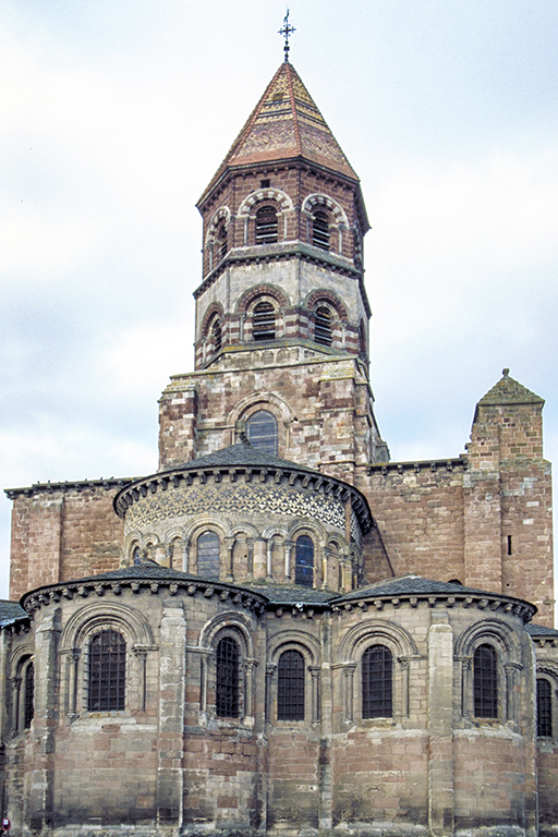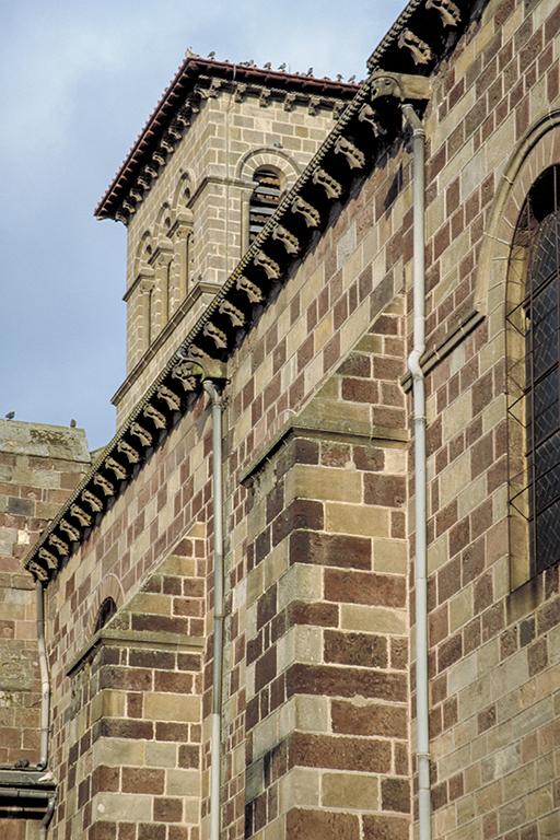 はオーヴェルニュ地方最大の教会で、スペインの聖地サンティアゴ・デ・コンポステーラに至る巡礼路に建っている。建設工事は12世紀の最初の四半期から 13世紀まで続いた。1枚目の写真は、内陣側から撮った翼廊の交差部に聳える鐘楼(19世紀の再建)。驚かされるのは、その多彩な美しさ。屋根瓦は、まるでブルゴーニュのように多色の釉薬をかけた小さな瓦が八角形の尖塔を覆い、その下の階には、まるで煉瓦のような赤砂岩が使われ、石灰岩砂岩が窓の上部を飾っている。その一段下は、色が逆転し、壁は石灰岩砂岩、窓脇は赤砂岩となる。さらに、その一段下は、赤砂岩、石灰岩砂岩、玄武岩、グラニュライト、灰色とピンクの大理石が、不規則に壁全体を覆っている。その下には、内陣の半円形の壁があり、窓の上部は、白い大理石と玄武岩が繊細な模様を作り、その直下の窓には、装飾的な柱頭の付いた柱による連続アーチが並んでいる。一番下の礼拝堂のだけは地味だが、この礼拝堂と上の内陣の軒下にはモディリオンが付いている。2枚目の写真は、その礼拝堂のモディリオンを強調して、鐘楼の上部2酸と一緒に撮ったもの。3枚目の写真は、礼拝堂のモディリオンだけ撮ったもので、人の顔、猛獣の頭や鳥や植物、怪物の頭、幾何学模様などが如何にもロマネスク的で、その隙間にもすべて簡単な飾りが入れてある。4枚目の写真は、ファサードの中央に設置された小型の角型鐘楼(19世紀に再建)を、身廊の横から撮ったもの。まだら模様の壁が素敵だし、軒下はモディリオンで溢れている。