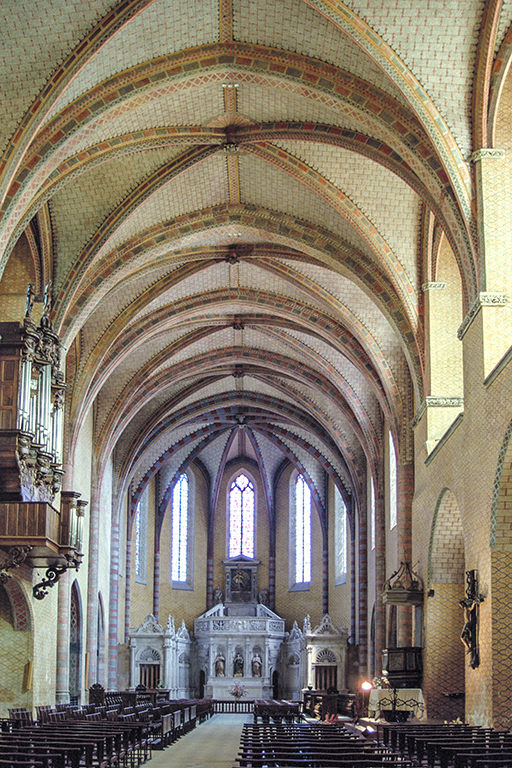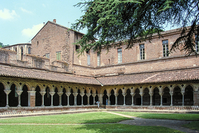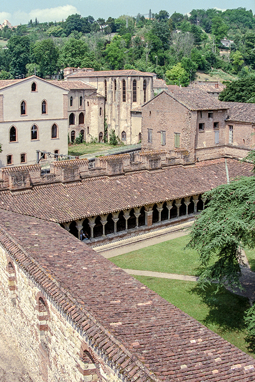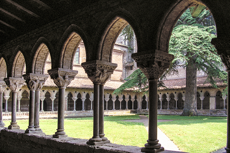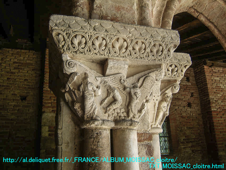 次に、モワサック修道院で一番重要な回廊。1枚目の写真は、41m×38mの回廊を、教会の鐘楼から見下ろして撮ったもの。2枚目の写真は回廊と中庭を撮ったもの。そして、3枚目の写真で一番印象的なのが、細い柱の向こうに中庭が透けて見える光景。ここで、高さ25mのレバノン杉が1本、中庭の中央でない場所に生えている。19世紀に植えられた(樹齢150年)と書かれているが、なぜレバノン杉で、それを片隅に植えたのかの説明は見つからなかった。モワサック修道院の回廊が1100年に完成したことは、「L'année de l'incarnation du Prince éternel 1100, a été fait ce cloître du temps d'Ansquetil abbé(この回廊は、永世の君主が顕現した1100年、アンスクエティルが修道院長の時建てられた)」という銘板が残っていることから明らか。石の列柱は、1147年に完成したフォントネー(No.40)や、1220年に完成したセナンク(No.56)の回廊に比べ、嘘のように細い。しかし、石の柱の上の柱頭彫刻は正真正銘のロマネスク様式で、しかも、その下の細い柱にぴったり合うように作られている。こんなことができた理由は、フォントネーやセナンクの回廊の天井が石造の半円ヴォールトだったので、その荷重を受け止めるには太い柱が必要だったのに対し、モワサックは木の板でできた瓦葺きの屋根で軽かったからであろう。ただ、柱頭と屋根の間に、煉瓦造の尖頭アーチのアーケードが連なっているのは、1100年の時点ではあり得ない。だから、この部分は、教会の方も下部を残して上部はすべて15世紀に作り直しているので、15世紀の改修であろう。そう言う意味では、1100年と15世紀の合体構造と見るのが正しいと思われる(1309年に完成したトゥールーズのジャコバン教会回廊(No.51)は、モワサックにそっくりだが、柱頭彫刻は小さくて単純)。4枚目の写真は、ロマネスク様式の多様な柱頭彫刻を撮ったもの。ただ、あまり面白いものがないので、専用のサイトから1枚拝借して、5枚目に掲載する。